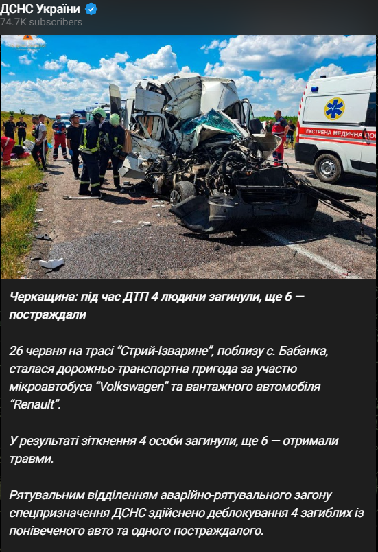 "26 июня на трассе "Стрый-Изварино", вблизи села Бабанка, произошло дорожно-транспортное происшествие с участием микроавтобуса Volkswagen и грузового автомобиля Renault. В результате столкновения 4 человека погибли, еще 6 получили травмы", - говориться в сообщении.