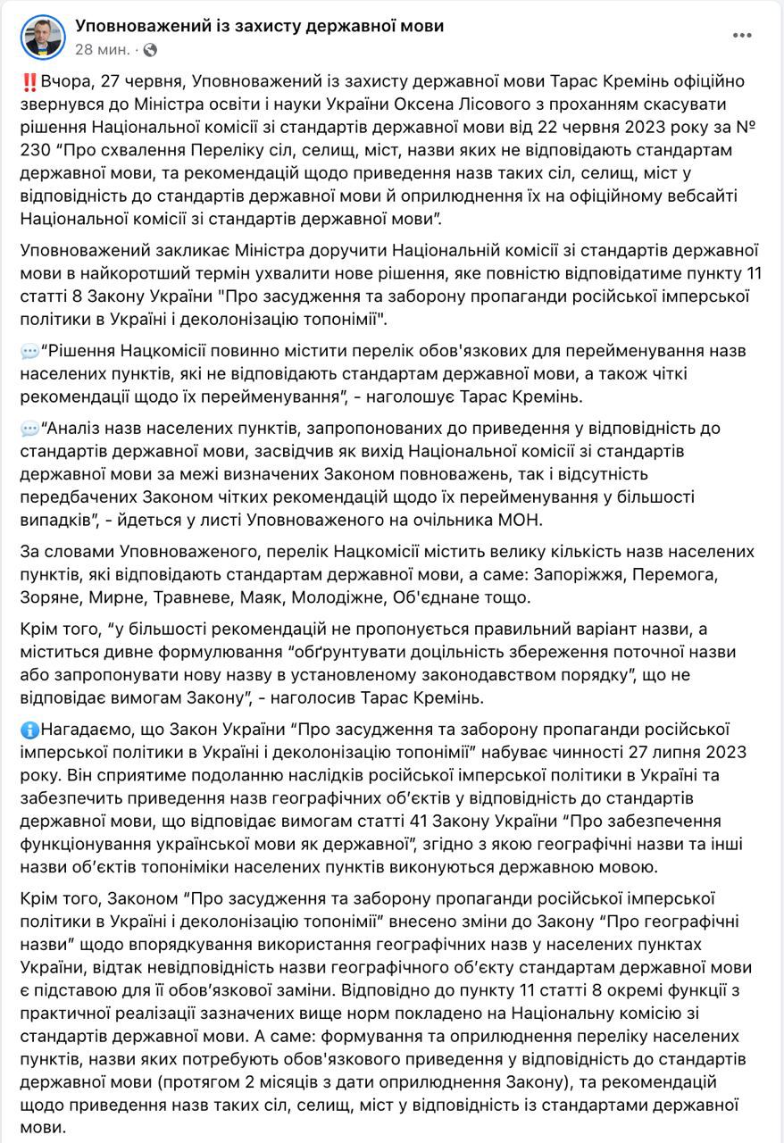 Уполномоченный по вопросам государственного языка Тарас Креминь призвал отменить рекомендации языковой Нацкомиссии относительно переименования украинских населенных пунктов, в частности, Запорожья.