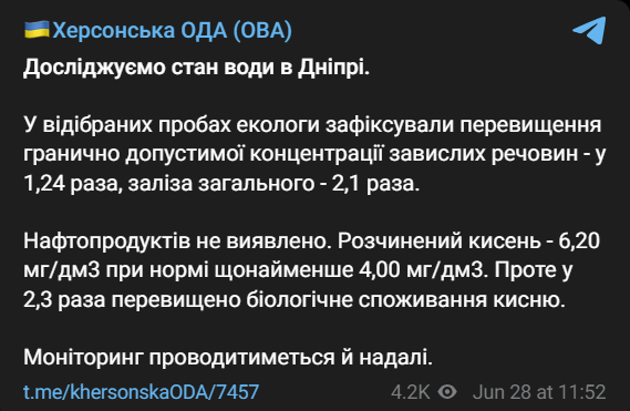 Исследования состояния воды в Днепре в районе Херсона показало превышение допустимой концентрации ряда веществ.