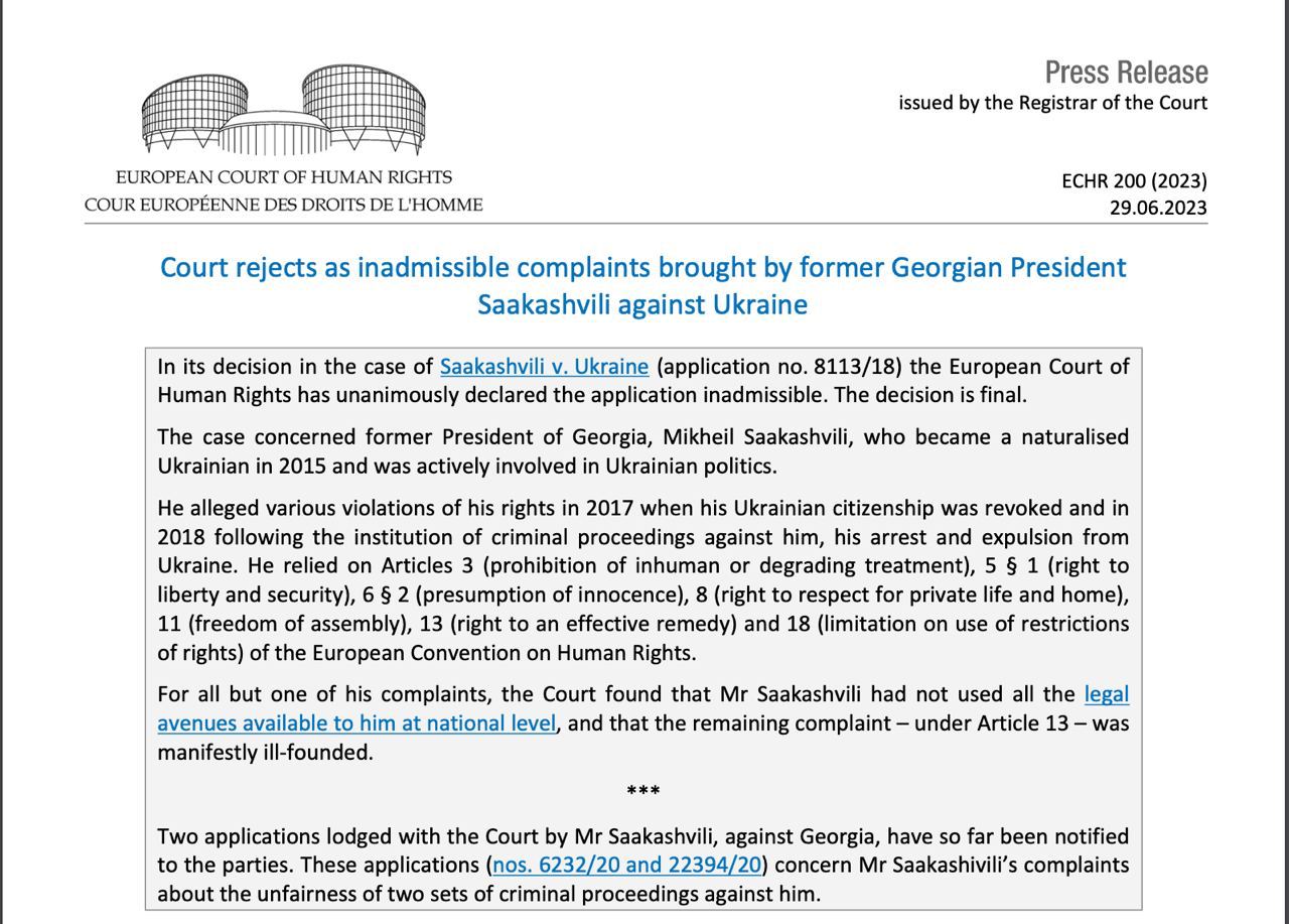 "В своем решении по делу "Саакашвили против Украины" (заявление № 8113/18) ЕСПЧ единогласно признал заявление неприемлемым. Решение является окончательным", — говорится в вердикте ЕСПЧ.