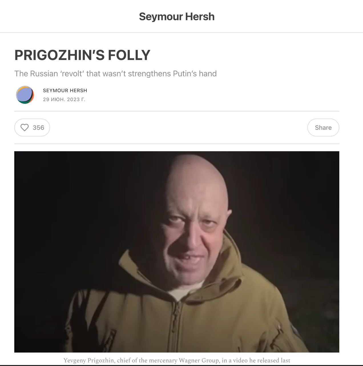 По данным Херша, американское разведка еще в январе осознала неизбежность конфликта Пригожина и минобороны. А в результате мятежа президент РФ Владимир Путин даже усилил свои позиции, пишет журналист.