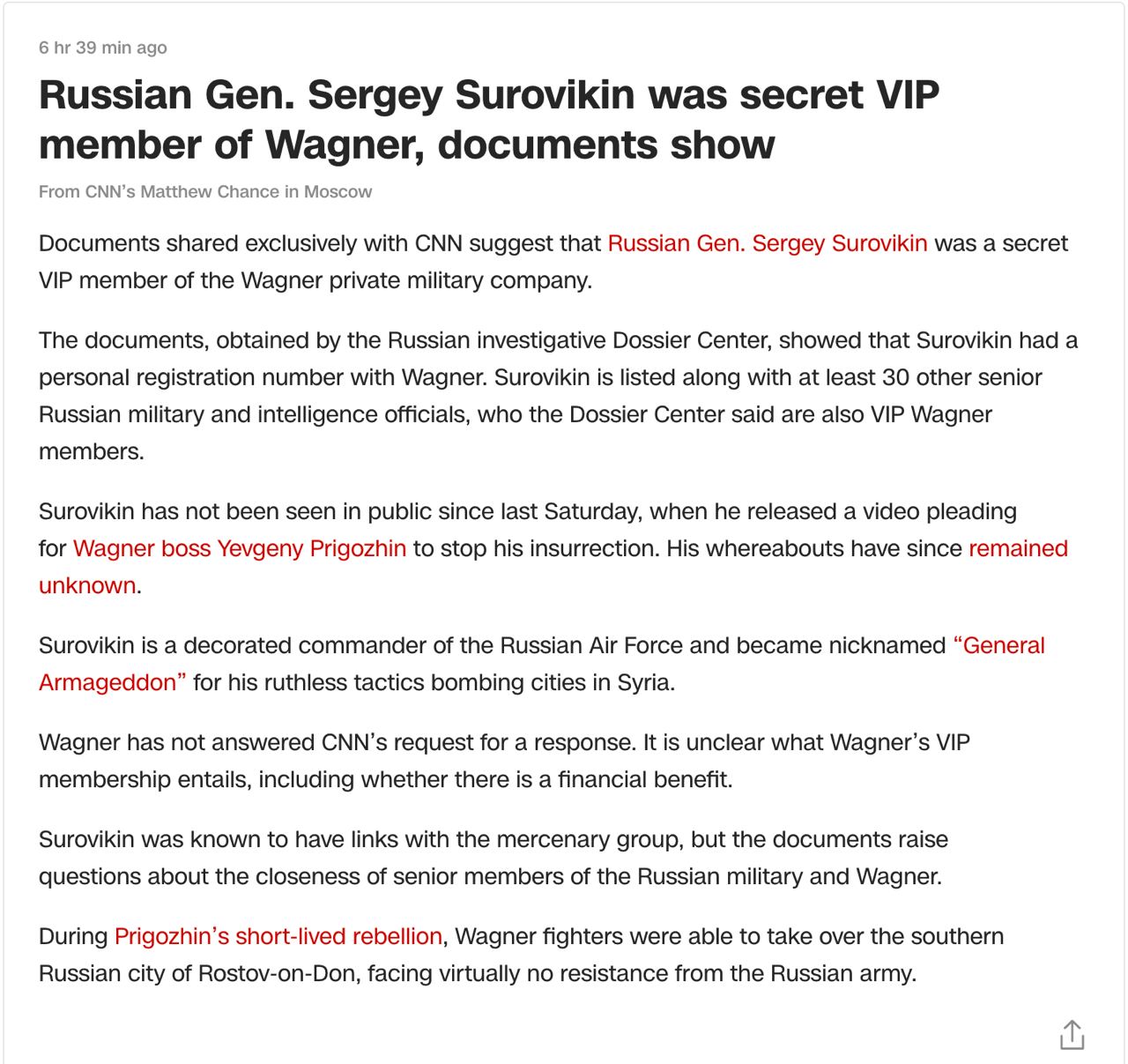 10.55 Суровикин был тайным высокопоставленным членом "Вагнера", сообщает CNN со ссылкой на некие документы, полученные редакцией.