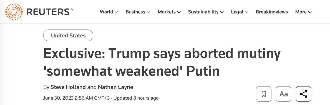 "Я думаю, что они (украинцы) имеют право оставить себе большую часть того, что они заработали, и я думаю, что Россия также согласится на это. Нужен правильный посредник или переговорщик, а у нас его сейчас нет. Я думаю, самое главное, что США должны сделать сейчас — это установить мир, собрать Россию и Украину вместе и заключить мир. Вы можете это сделать. Настало время сделать это, собрать две стороны вместе и добиться мира", — заявил Трамп в интервью Reuters.