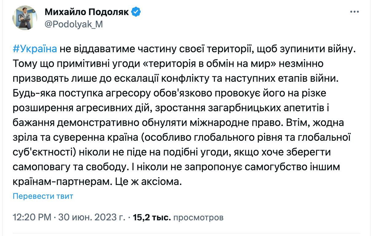 Советник главы ОП Подоляк заявил, что Украина не станет разменивать территорию на мир.