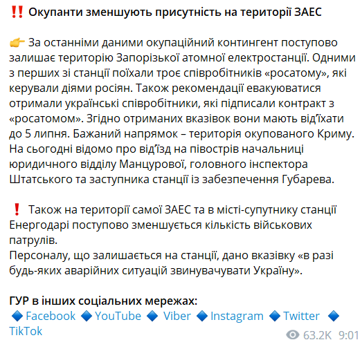 "Одними из первых со станции уехали трое сотрудников "Росатома", руководивших действиями россиян. Также рекомендации эвакуироваться получили украинские сотрудники, подписавшие контракт с "Росатомом". Согласно полученным указаниям, они должны отъехать до 5 июля. Желательное направление – территория оккупированного Крыма. На сегодняшний день известно об отъезде на полуостров начальницы юридического отдела Манцуровой, главного инспектора Штатского и заместителя станции по обеспечению Губарева", - говорится в сообщении ГУР.