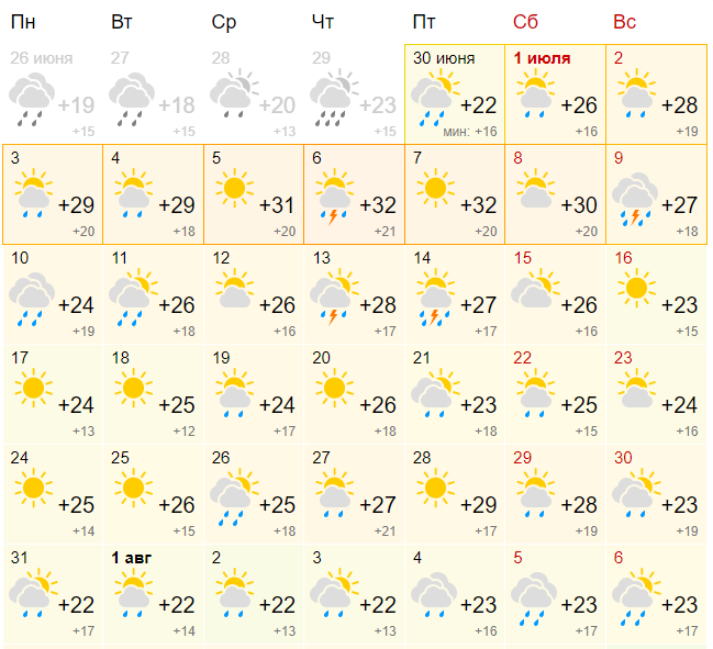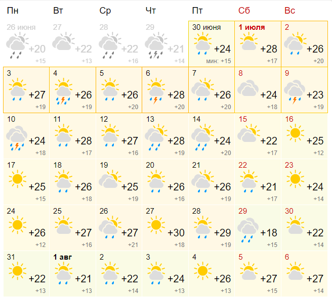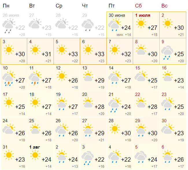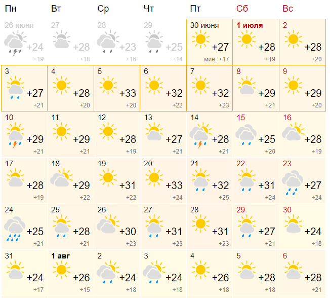 Средняя температура днем +25. Ниже двадцати градусов столбики термометров будут опускаться лишь один раз, 29-го числа, до +18.