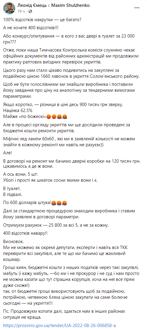 Депутат Киеврады Леонид Емец, который входит в контрольную комиссию, сообщил, что в киевские укрытия закупили двери в туалет за 23 тысяч гривен.