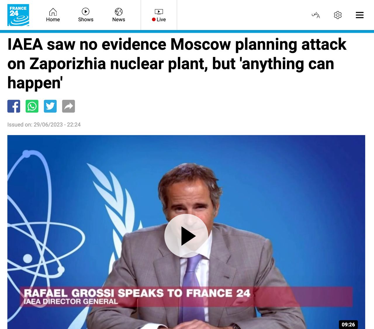 Гендиректор Международного агентства по атомной энергии Рафаэль Гросси заявил, что специалисты МАГАТЭ не увидели признаков подготовки РФ теракта на Запорожской АЭС. При этом он не исключил, что "все может случиться".