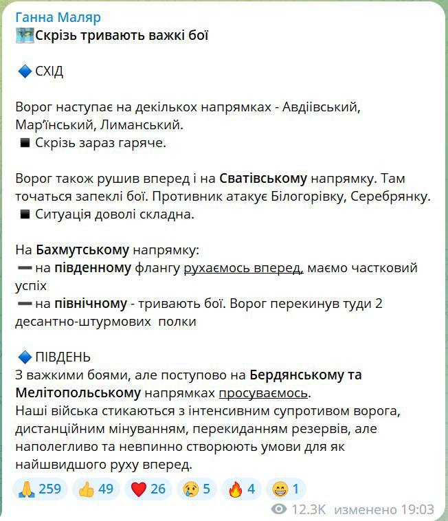 "Враг наступает на нескольких направлениях: Авдеевском, Марьинском, Лиманском. Везде сейчас горячо. Враг также двинулся вперед и на Сватовском направлении. Там ведутся ожесточенные бои. Противник атакует Белогоровку, Серебрянку. Ситуация довольно сложная", – написала она.