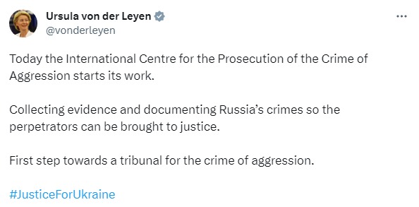 "Сегодня начинает работу Международный центр по расследованию преступлений агрессии. Сбор доказательств и документирование преступлений России, чтобы виновные могли быть привлечены к ответственности. Первый шаг к трибуналу за преступление агрессии", - сказано в записи еврочиновницы.