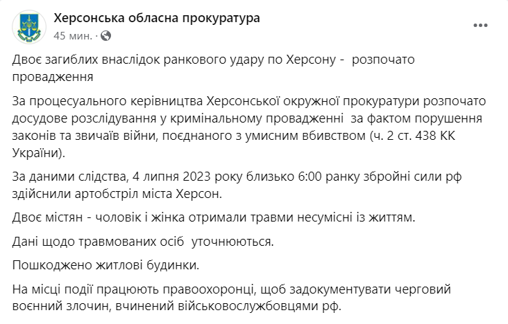 "4 июля 2023 года около 6:00 утра вооруженные силы России совершили артобстрел города Херсон. Два человека - мужчина и женщина получили травмы несовместимые с жизнью", - говорится в сообщении.