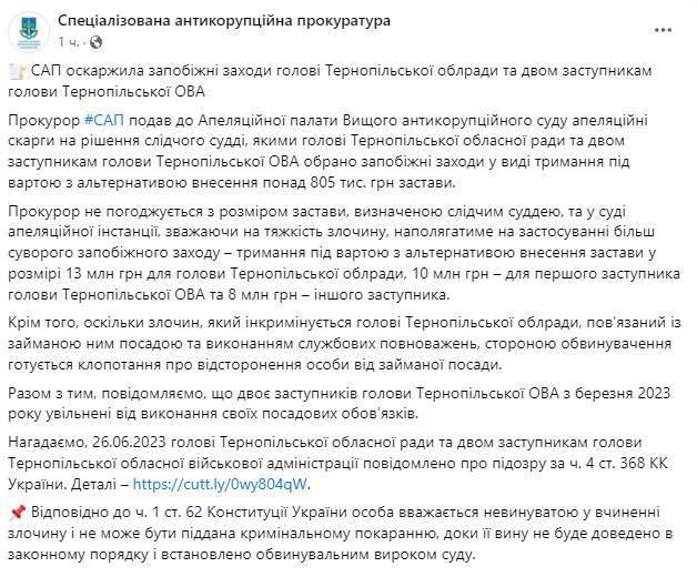 "Прокурор не соглашается с размером залога, определенного следственным судьей, и в суде апелляционной инстанции, учитывая тяжесть преступления, будет настаивать на применении более строгой меры пресечения – содержания под стражей с альтернативой внесения залога в размере 13 млн грн для председателя Тернопольского облсовета, 10 млн грн – для первого заместителя главы Тернопольской ОВА и 8 млн грн – другого заместителя", - сказано в посте САП.
