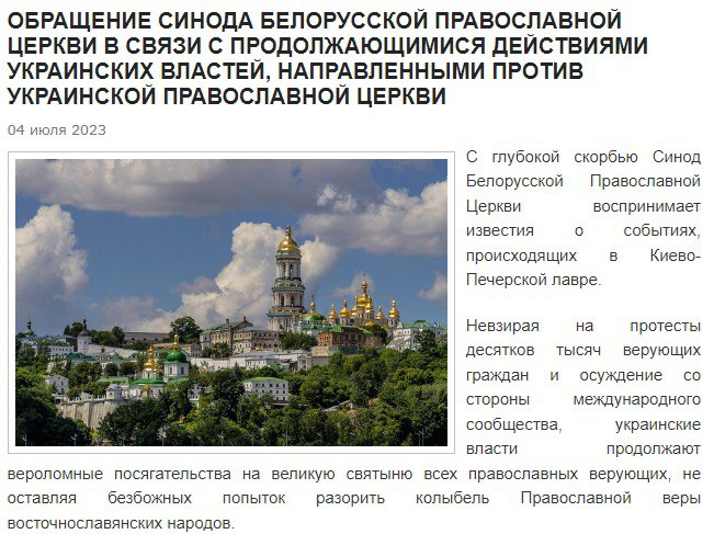 "Синод Белорусской православной церкви свидетельствует, что в случае насильственного выселения монашествующих из Киево-Печерской лавры они могут обрести место дальнейшего иноческого подвига в монашеских обителях Белорусской православной церкви", - сказано в заявлении.