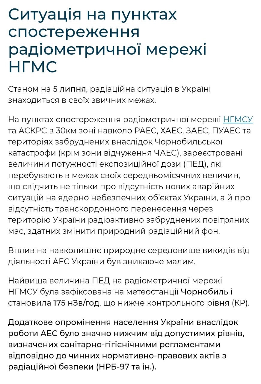 Также, по состоянию на 5 июля в Украине не зафиксировано превышения радиационного фона.
