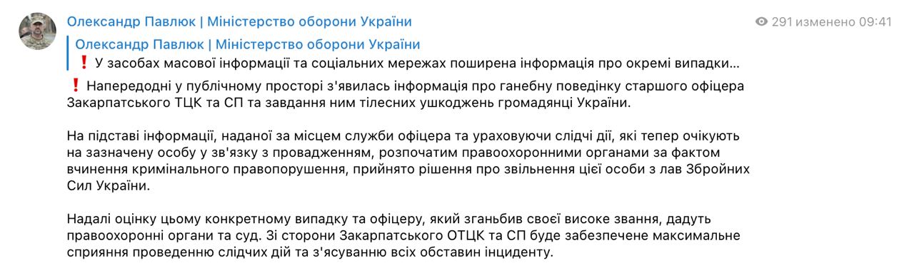 "На основании информации, предоставленной по месту службы офицера и учитывая следственные действия, которые теперь ожидают указанное лицо в связи с производством, начатым правоохранительными органами по факту совершения уголовного правонарушения, принято решение об увольнении этого лица из рядов Вооруженных сил Украины", - написал Павлюк.