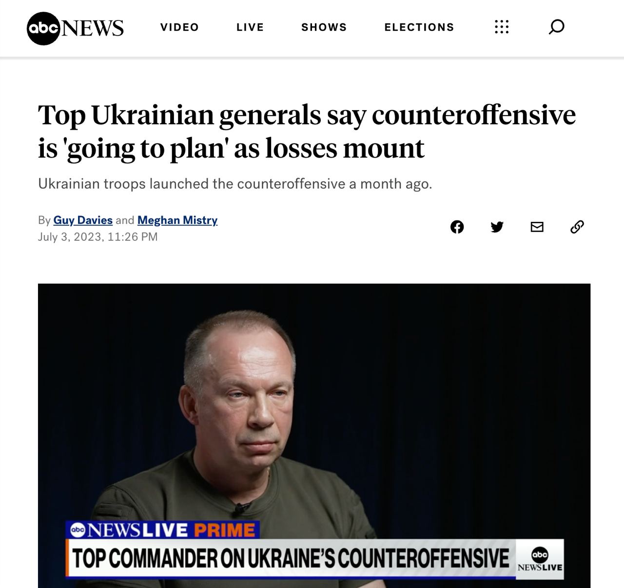 Украинское наступление идет по плану, заявил командующий Сухопутных войск Александр Сырский в интервью ABC News.