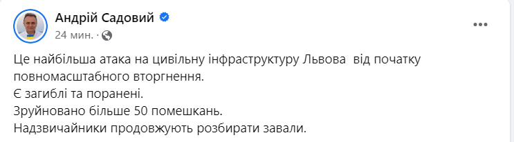 "Это самая большая атака на гражданскую инфраструктуру Львова с начала полномасштабного вторжения. Есть погибшие и раненые. Разрушены более 50 жилищ. Спасатели продолжают разбирать завалы", - сообщил Садовой.