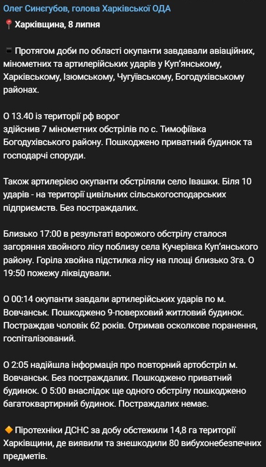 Харьковская область 8 июля оказалась под обстрелами оккупантов. В разных районах области были зафиксированы авиационные, минометные и артиллерийские удары.