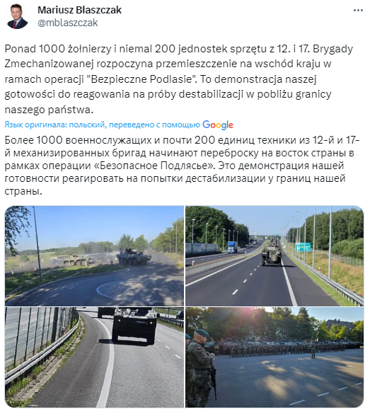 "Свыше 1000 военных и почти 200 единиц техники из 12-й и 17-й механизированных бригад начинают движение на восток страны в рамках операции "Безопасное Подляшье". Это демонстрация нашей готовности реагировать на попытки дестабилизации у границы нашей страны", - написал он.