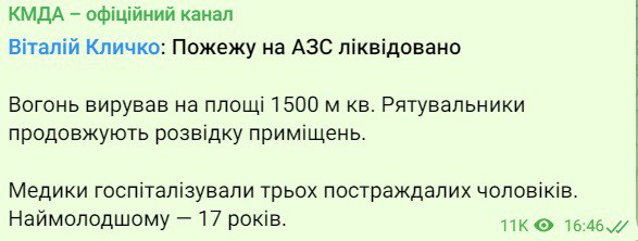 Телеграм-каналы выяснили, что на АЗС сгорело по меньшей мере пять автомобилей. Однако позже Кличко уточнил, что пожар возник вследствие удара легкового автомобиля в заправочную колонку и полностью уничтожил здание, наземное оборудование АЗС и восемь легковых автомобилей.