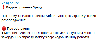 "На своем заседании 11 июля Кабинет министров Украины принял распоряжение об уходе Мельника Андрея Ярославовича с должности заместителя министра иностранных дел (в связи с переходом на другую работу)", - говорится в сообщении в Telegram.