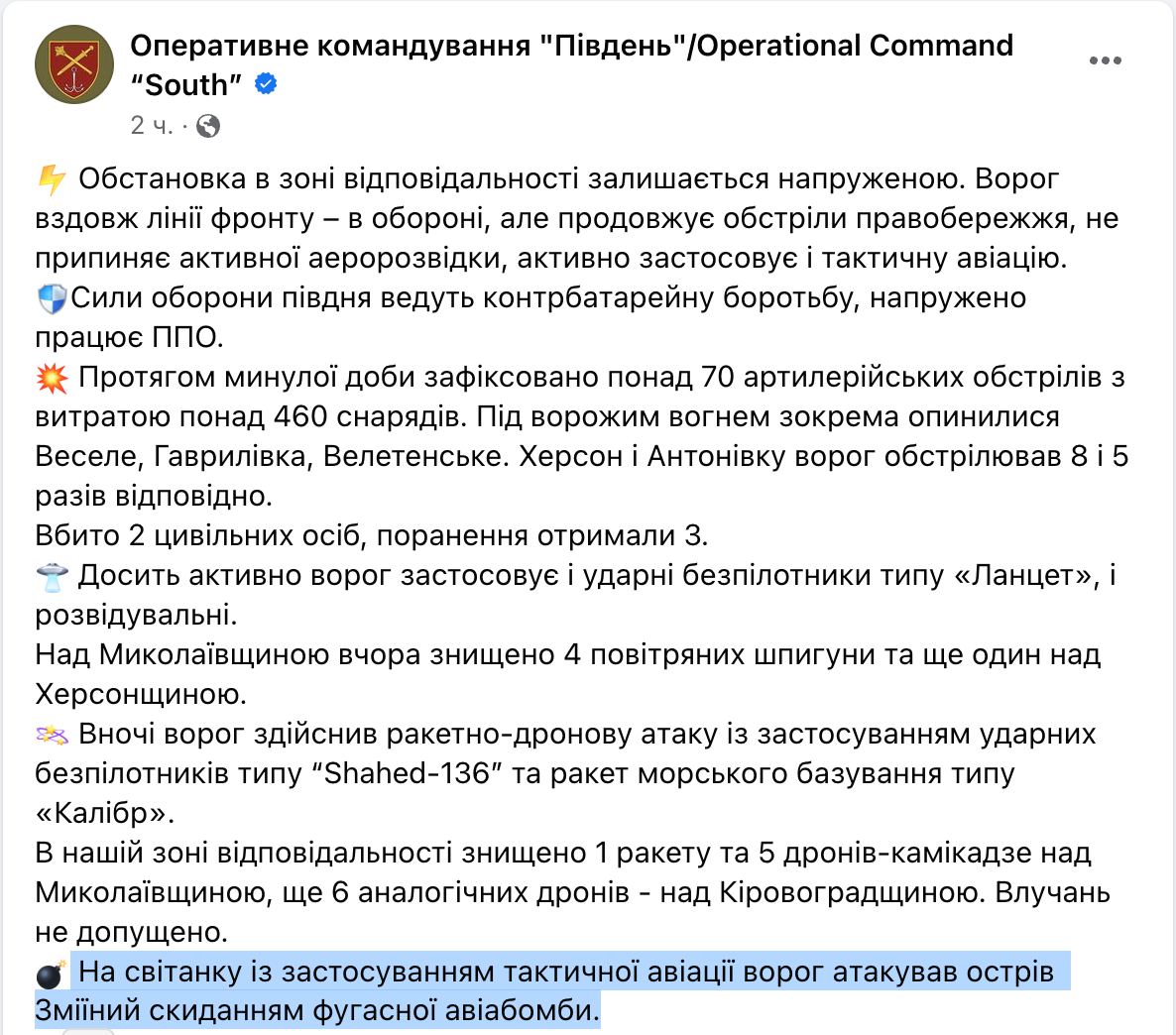 13.30 В оперкомандовании "Юг" сообщают, что на рассвете российская армия сбросила на остров фугасную авиабомбу.