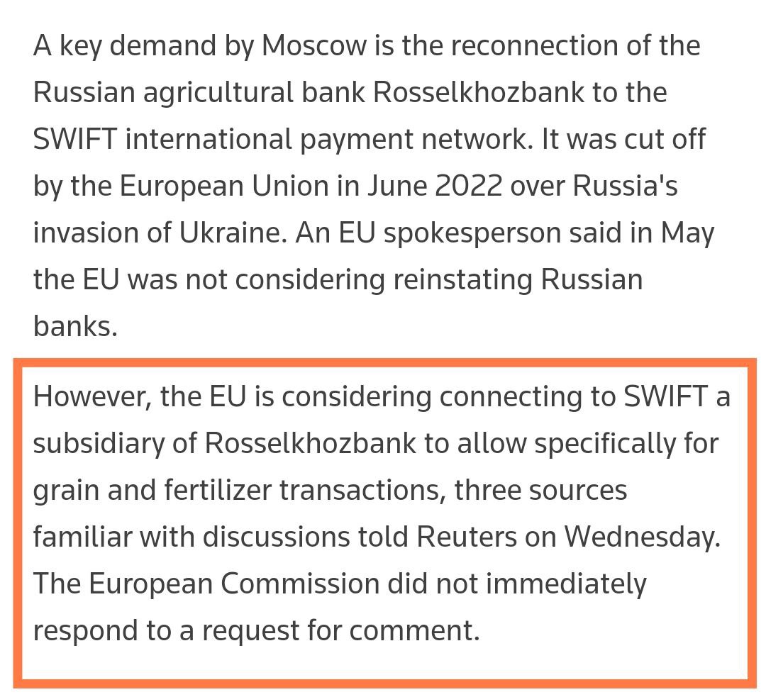 Ранее мы писали о том, что Евросоюз может разрешить подключение "дочки" Россельхозбанка к SWIFT для продления зерновой сделки.