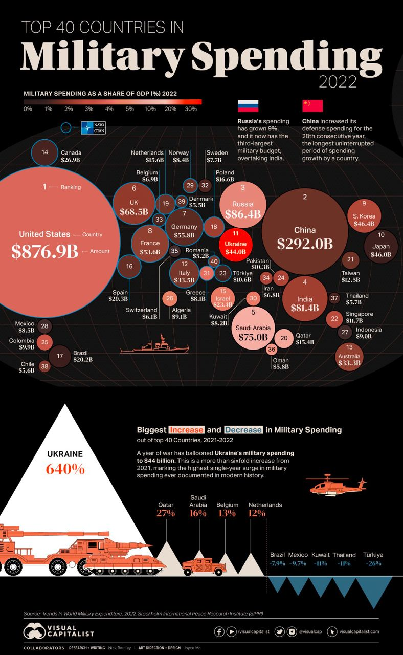 Это самый большой прирост военных расходов в мире не только в прошлом году, но и за всю современную историю, отмечается в инфографике Visual Capitalist.