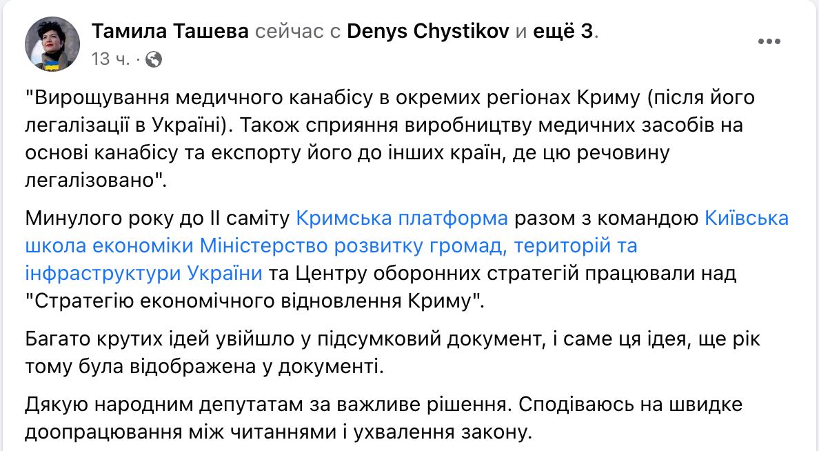 "Выращивание медицинского каннабиса в отдельных регионах Крыма (после его легализации в Украине). Также содействие производству медицинских средств на основе каннабиса и экспорту его в другие страны, где это вещество легализовано", - пишет Ташева.