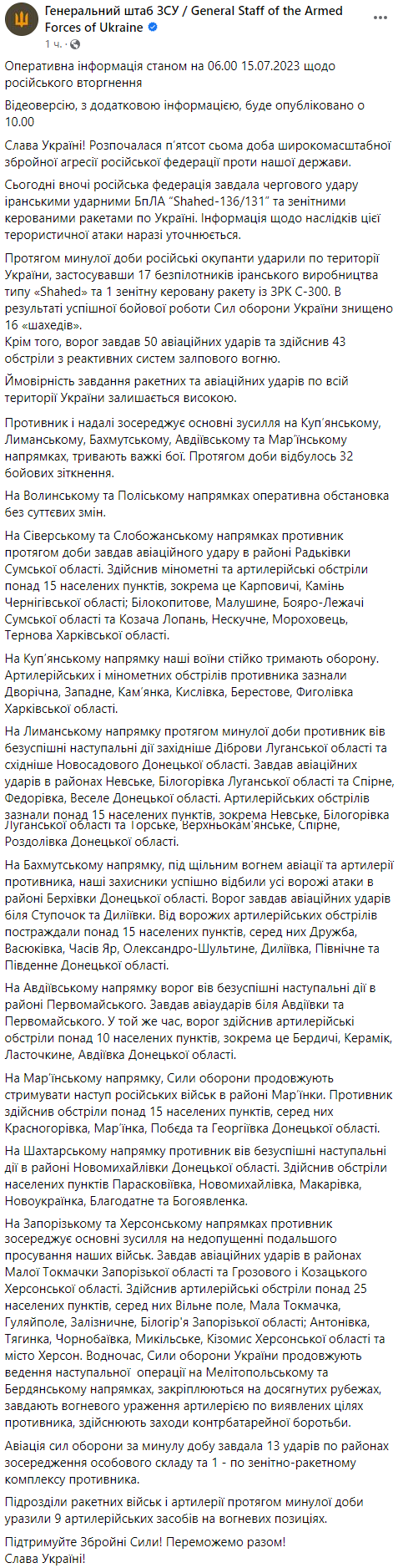 Генштаб ВСУ публикует оперативную военную сводку на утро 15 июля. Ночью РФ нанесла очередной удар "Шахедами" и зенитными управляемыми ракетами по Украине, выпустив 17 беспилотников иранского производства типа "Shahed" и 1 зенитную управляемую ракету с ЗРК С-300. Украинское ПВО уничтожило 16 целей.