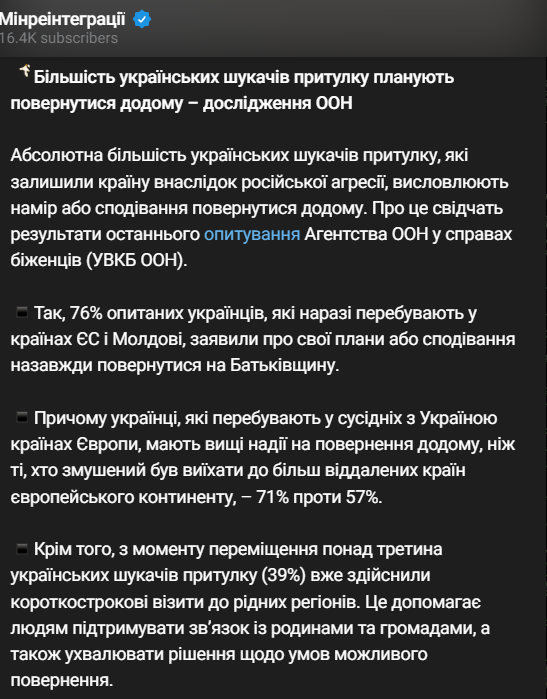 Согласно данным опроса Агентства ООН по делам беженцев (УВКБ ООН), абсолютное большинство украинских беженцев, покинувших страну из-за войны, выражают намерение или надежду вернуться домой.