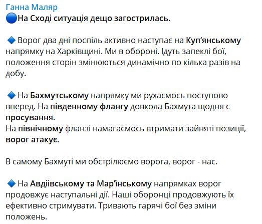 "Мы в обороне. Идут ожесточенные бои, положения сторон меняются динамически по несколько раз в сутки", - написала Маляр.