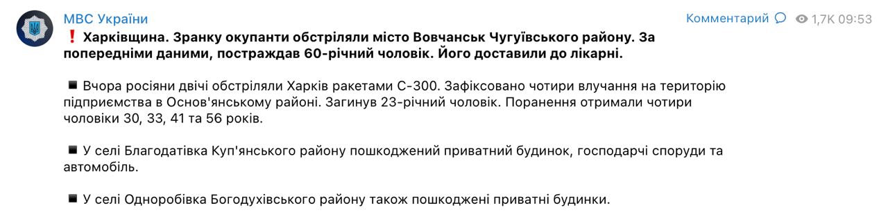 10:10 Оба вчерашних удара по Харькову ракетами С-300 пришлись по предприятию в Основянском районе, сообщает МВД.