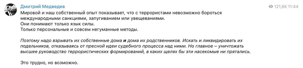 "Надо взрывать их собственные дома и дома их родственников. Искать и ликвидировать их подельников, отказываясь от пресной идеи судебного процесса над ними. Но главное – уничтожать высшее руководство террористических формирований, в каких щелях бы эти насекомые ни прятались. Это трудно, но возможно", - написал Медведев.