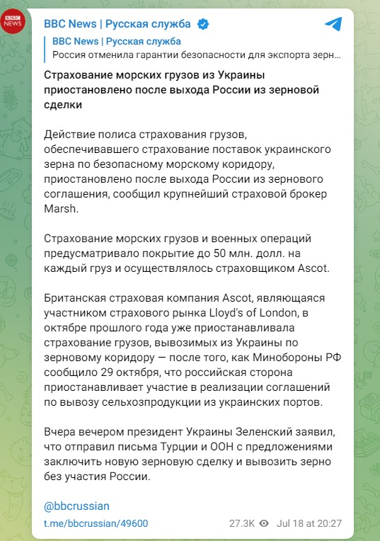 Британская страховая компания Ascot, являющаяся участником страхового рынка Lloyd's of London, в октябре прошлого года уже приостанавливала страхование грузов, вывозимых из Украины по зерновому коридору — после того, как Минобороны РФ сообщило 29 октября, что российская сторона приостанавливает участие в реализации соглашений по вывозу сельхозпродукции из украинских портов.