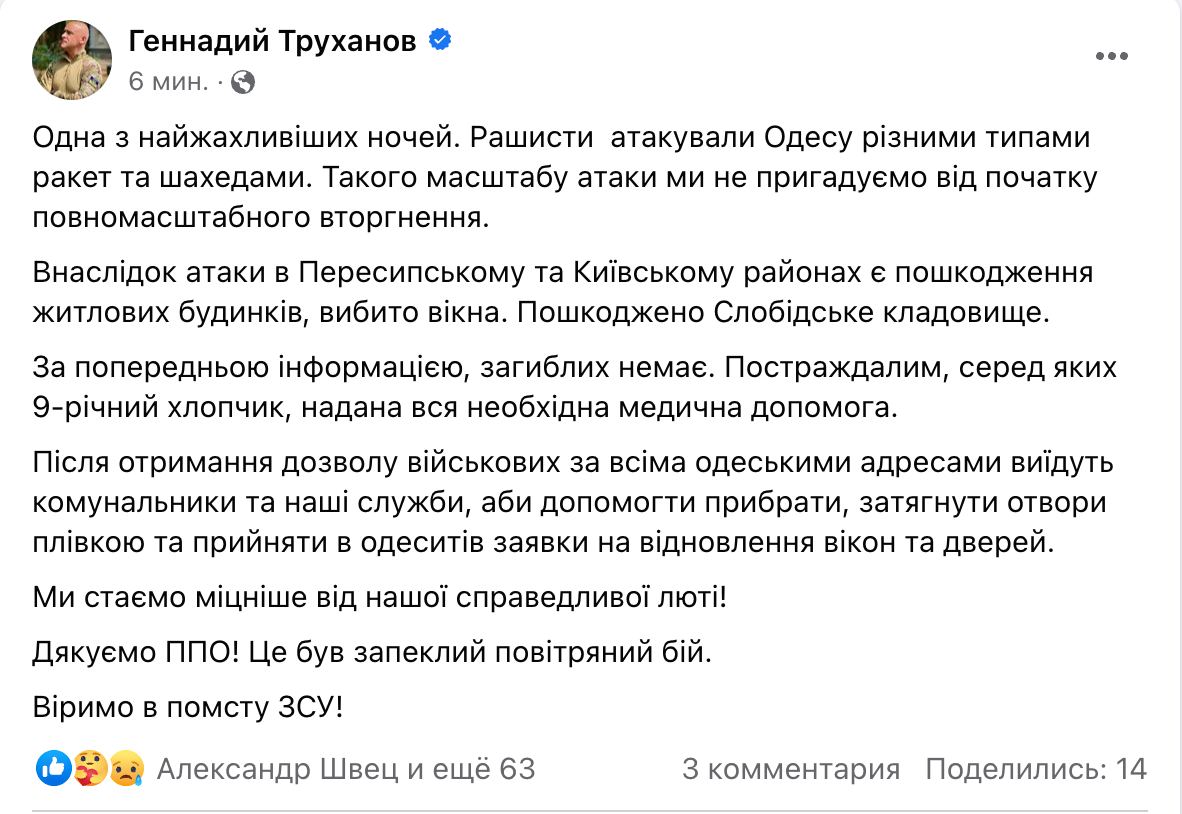 10:16 Таких ночей, как сегодня, в Одессе не было за всю войну, заявил мэр Труханов.