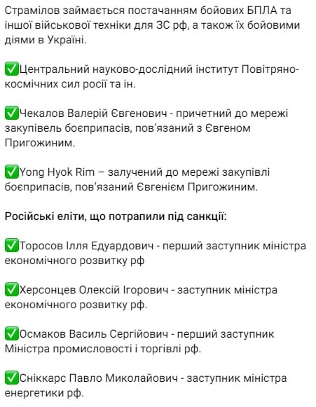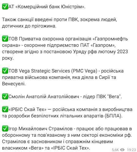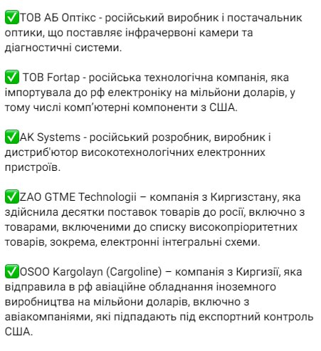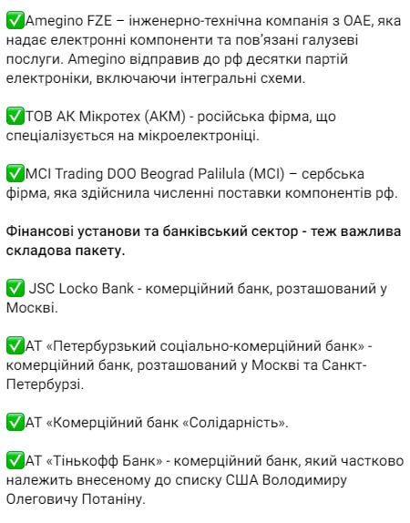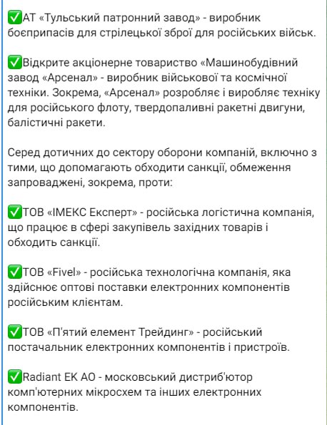 Под ограничениями оказываются российские производители оружия и высокотехнологичные отрасли, поддерживающие оборонную промышленность России, а также компания из Сербии и Тинькофф банк.