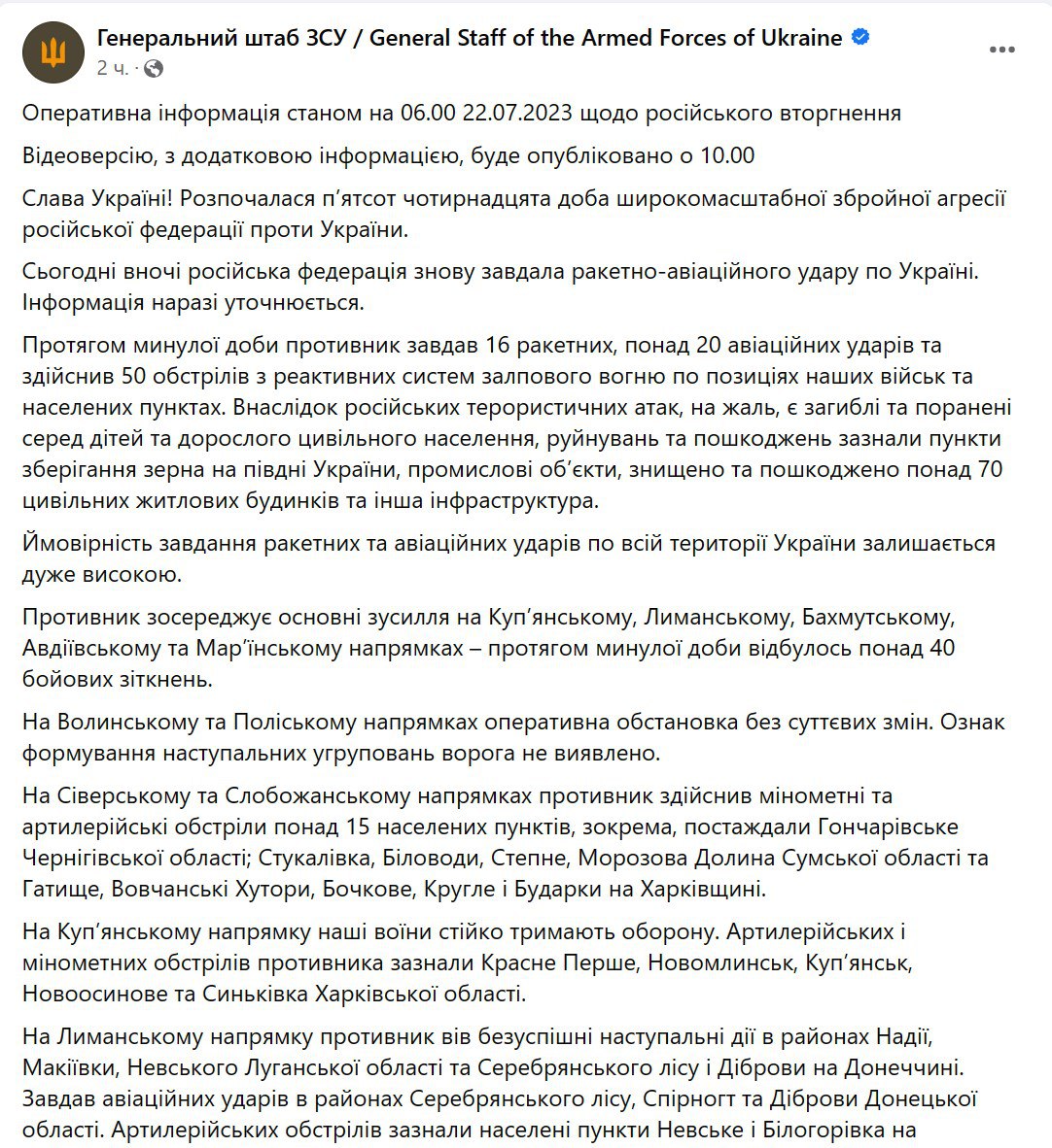 Сводка Генштаба ВСУ по состоянию на 18:00 22 июля 2023 года