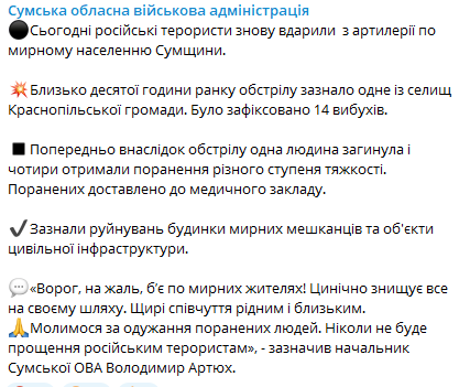 15:10 Сегодня российские войска снова ударили из артиллерии по мирному населению Сумской области. Обстрелам подверглось одно из сел Краснопольской общины. Обстрел произошел около десяти часов утра, было зафиксировано 14 взрывов.