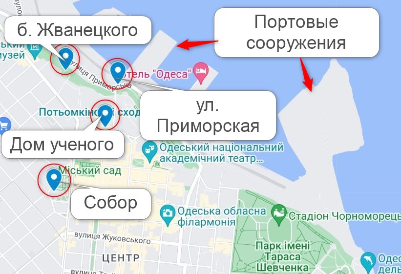 Отметим, что все перечисленное находится в непосредственной близости от моря и портовой инфраструктуры. Самый отдаленный - собор в километре от портовых терминалов, а Дом ученого уже 300 метрах от моря. Бульвар Жванецкого - еще ближе.