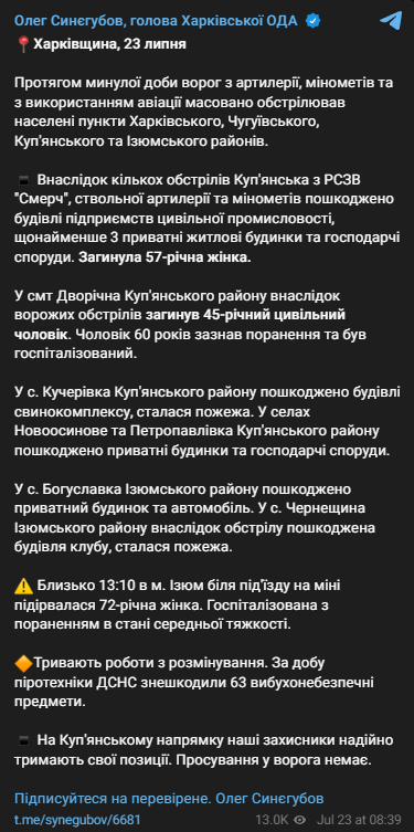 "В пгт Двуречная Купянского района в результате вражеских обстрелов погиб 45-летний гражданский мужчина. Мужчина 60 лет получил ранение и был госпитализирован", - написал Синегубов.