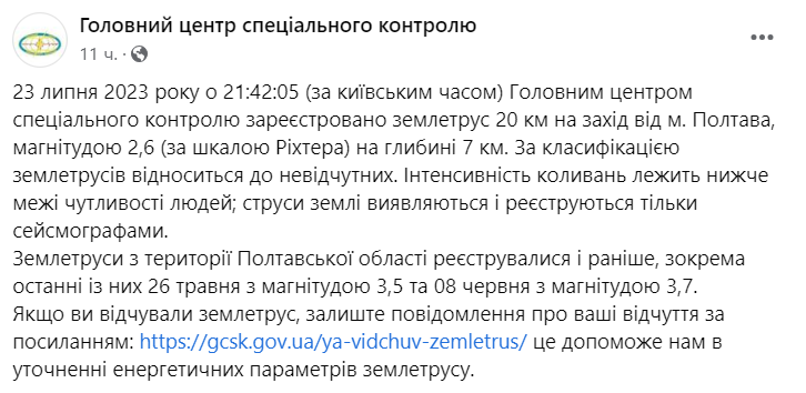 Эпицентр находился на глубине 7 км на территории бывшего Решетиловского района. Он был зарегистрирован в 21:43, сообщается в центре.