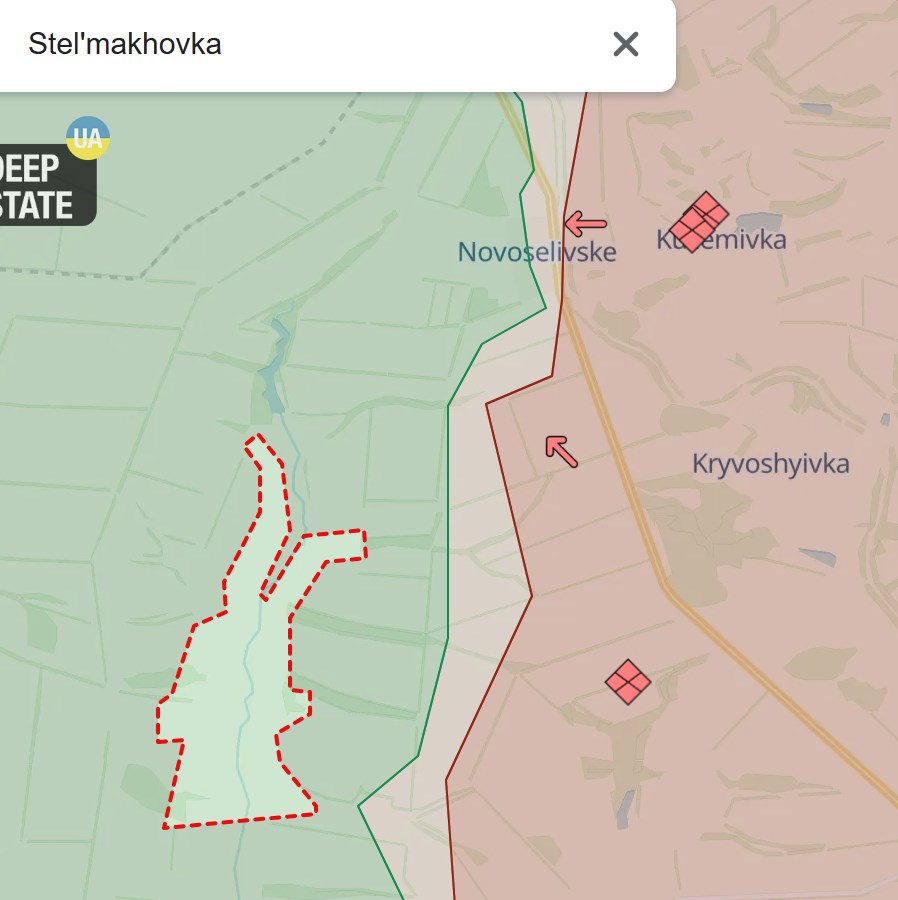 Сегодня утром паблик подтвердил свои данные и заявил, что россияне настроились на захват Стельмаховки (севернее обсуждаемого участка). Минобороны РФ заявило, что россияне "заняли более выгодные позиции" рядом со Стельмаховкой, в районе Куземовки.