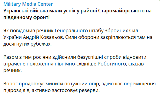 ВСУ имели успех на направлении Старомайорского на Времьевском выступе. Силы обороны закрепляются там на достигнутых рубежах.