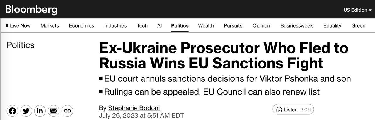 Пшонка, возглавлявший ГПУ во времена президентства Януковича, и его сын впервые попали под санкции ЕС в 2014 году как лица, подлежащие уголовному преследованию в Украине за якобы "растрату украинских государственных средств и их незаконный вывод за пределы Украины".