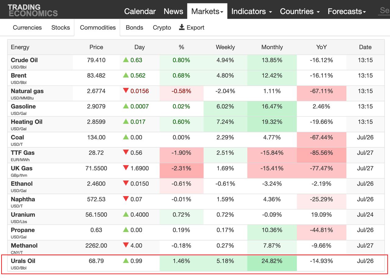 По данным сервиса Тradingeconomics, сейчас российская нефть марки Urals торгуется на уровне 68 долларов за баррель.