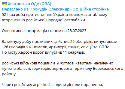 "За минувшие сутки противник совершил 29 обстрелов, выпустив 126 снарядов из минометов, артиллерии, танков, авиации и БПЛА. По городу Херсон враг выпустил 11 снарядов", - говорится в сообщении.