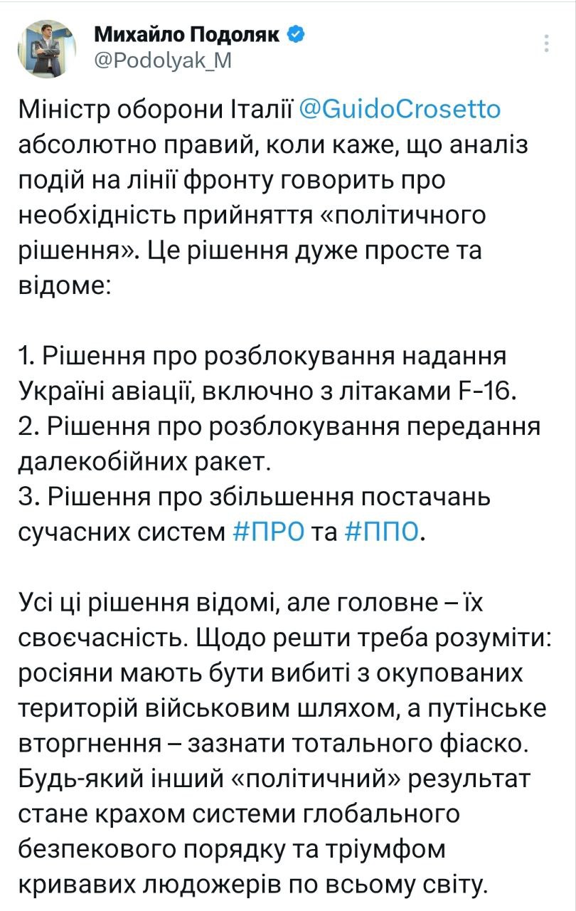 08.52 В Офисе президента Украины ответили министру обороны Италии Гвидо Крозетти, который заявил, что война идёт к "политическому решению".