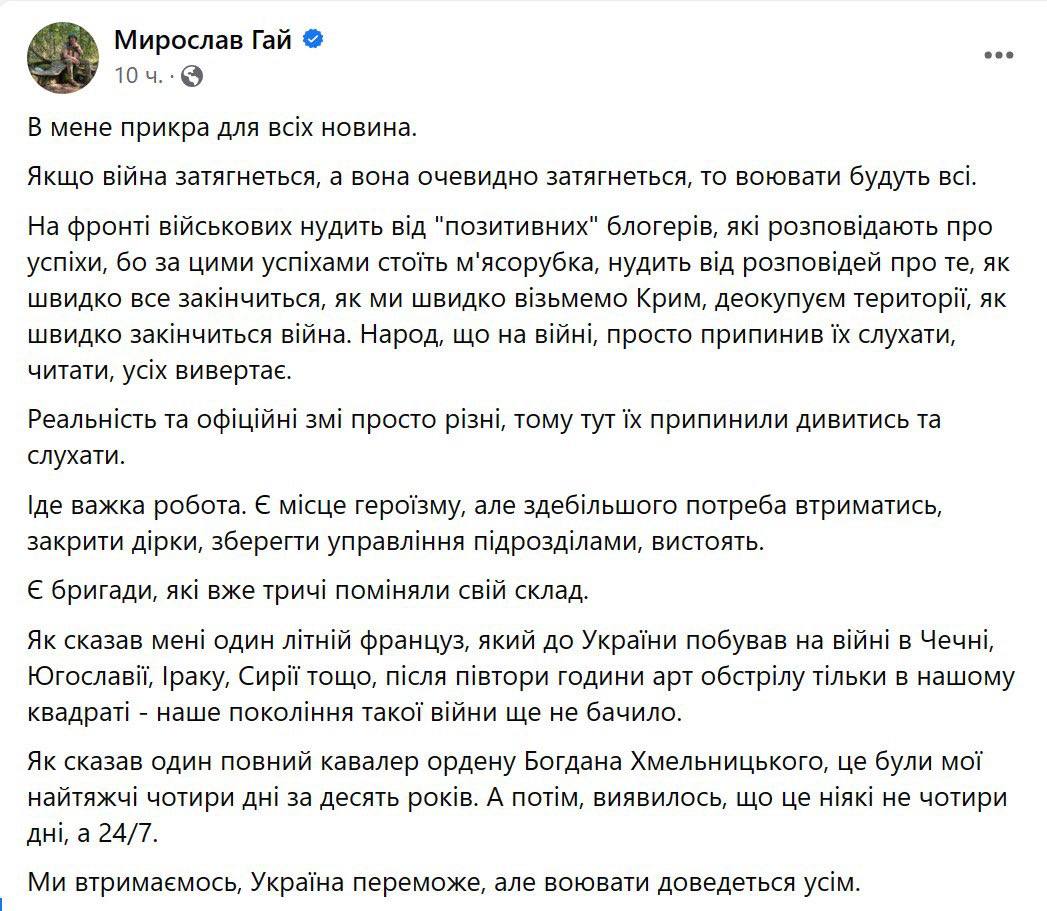 О том же написал волонтер, воюющий в рядах ВСУ, Мирослав Гай. "Если война затянется, а она, очевидно, затянется, то воевать будут все", - пишет он.
