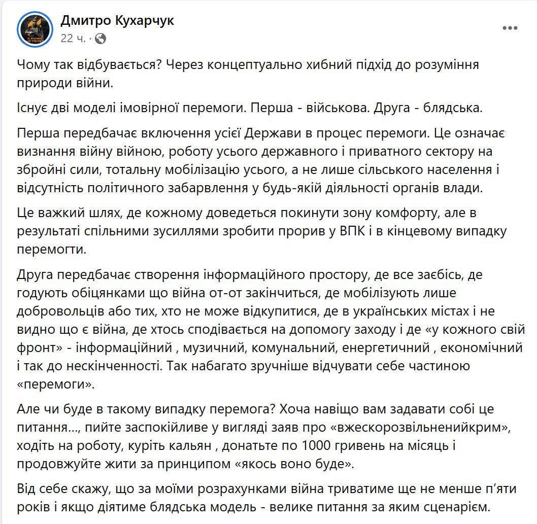 Для военной победы нужно провести "тотальную мобилизацию всего, а не только сельского населения", пишет комбат 3-й ОШбр Дмитрий Кухарчук.